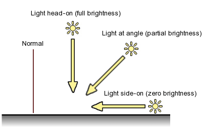 三角形足以定义对象的基本形状,但在大多数情况下需要额外的信息来显示网格。为了让对象正确着色以获得光照,必须为每个顶点提供法向矢量。法线是向外指向的矢量,垂直于与其相关联的顶点位置处的网格表面。在着色计算期间,会将每个顶点法线与入射光的方向进行比较(入射光也是矢量)。如果两个矢量完全对齐,则会在该位置表面正面接收光照,并会将全部光照亮度用于着色。与法向矢量完全相反的光不会在该位置表面产生任何光照。通常情况下,到达的光线与法线之间呈一定的角度,因此着色将介于全亮和全暗之间,具体取决于角度大小。