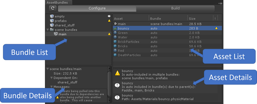 此工具使用户能够查看和编辑 Unity 项目的资源包的配置。它将阻止会创建无效捆绑包的编辑,并告知现有捆绑包的任何问题。此外还会提供基本的构建功能。
