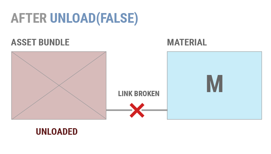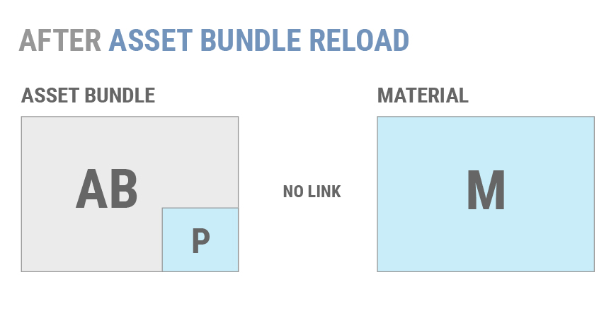 如果稍后再次加载 AB 并且调用 AB.LoadAsset(),则 Unity 不会将现有 M 副本重新链接到新加载的材质。而是将加载 M 的两个副本。