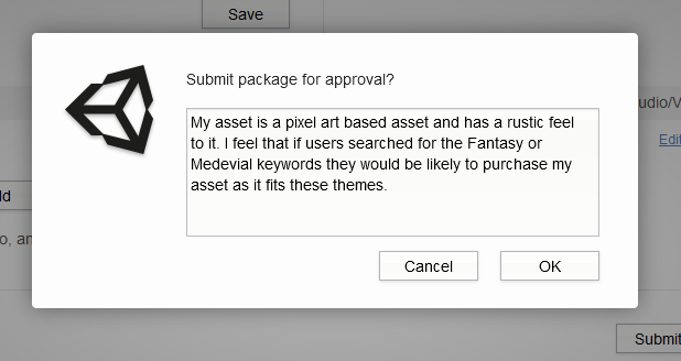 请添加供 Asset Store 专家查看的提交备注(单击“Submit package for approval”后会立即弹出),说明选择关键字的原因。这将是他们用来做出决策并加快更新的重要信息。