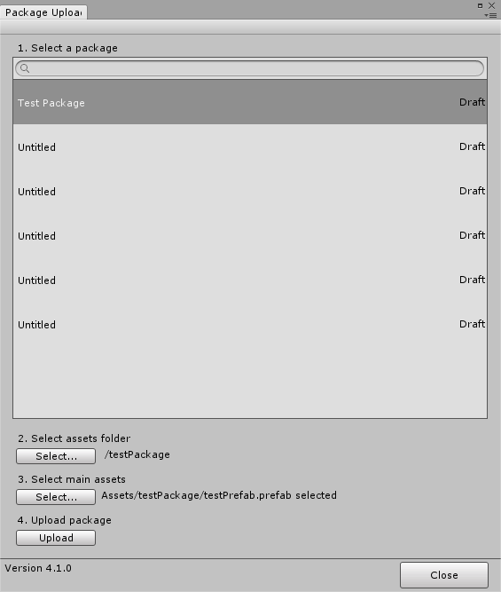 1.选择 Asset Store Tools > Package Upload。随后将显示以下对话框: