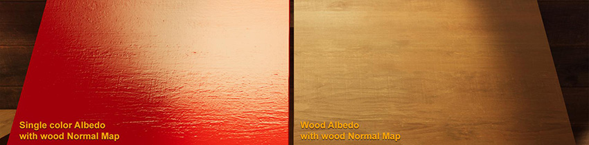 您还可以使用法线贴图来定义材质。例如,对于涂有高光泽红色饰面的木材,可显示原始表面材质: