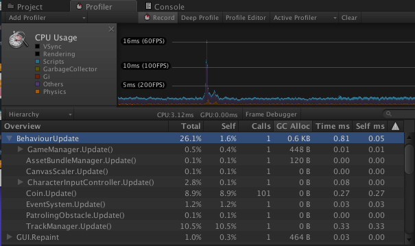 跟踪托管内存分配情况相对简单。在 Unity 的 CPU 性能分析器中,Overview 表有一个“GC Alloc”列。此列显示了在特定帧中的托管堆上分配的字节数(4)(__注意:__这与给定帧期间临时分配的字节数不同。性能分析器会显示特定帧中分配的字节数,不考虑在后续帧中是否重用了部分/全部已分配的内存)。启用“Deep Profiling”选项后,可以跟踪执行这些分配的方法。