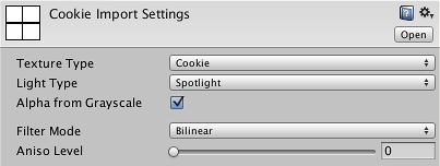 将剪影导入 Unity 后,从 Project 视图中选择该剪影,然后在检视面板中将 Texture Type 设置为 Cookie。除非您已经自己设计了图像的 Alpha 通道,否则还应启用 Alpha From Grayscale。