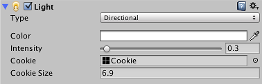 聚光灯和点光源直接根据锥体或球体的大小来缩放剪影。方向光有一个附加的 Cookie Size 选项可让您自行缩放剪影;缩放操作适用于 Spotlight 和 Directional 两种类型的剪影。