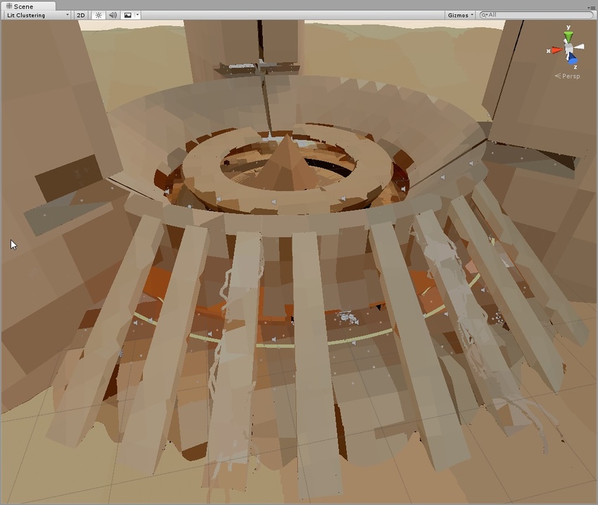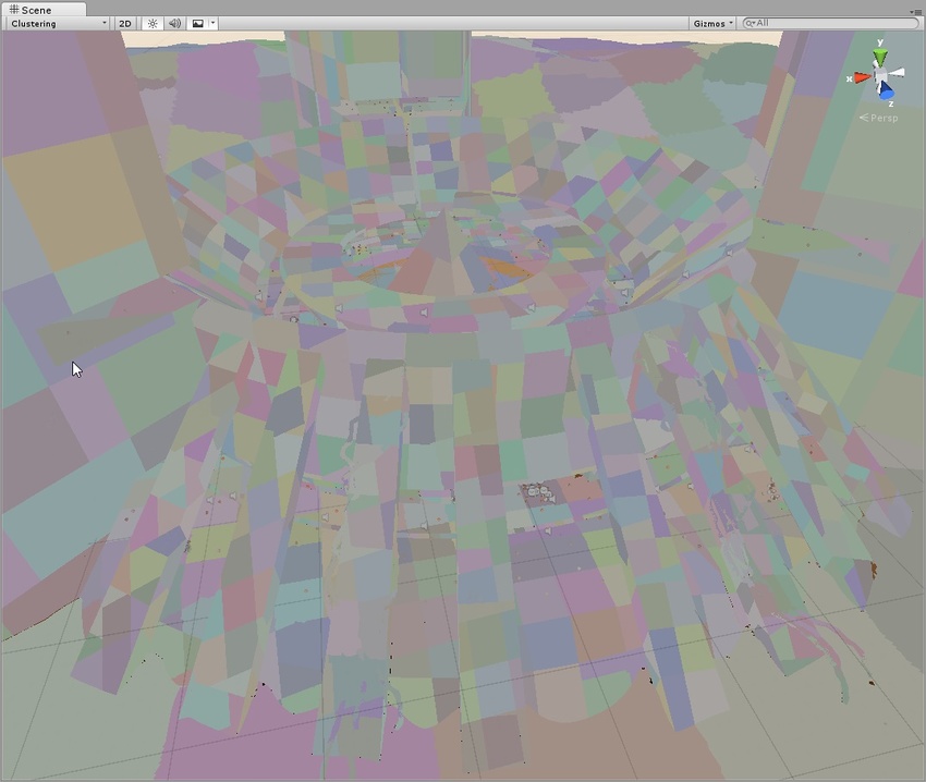 此选项显示 Enlighten 通过光照贴图静态几何体生成的聚类。Enlighten 使用在“创建聚类”(Clustering) 步骤中生成的聚类来计算间接光照。生成的聚类应该大于光照贴图纹理像素(比率由光照贴图参数中的 Cluster Resolution 参数控制)。如果未正确设置比例,几何体转换为聚类的步骤可能会占用大量内存。 如果您看到内存使用量高或烘焙时间长,可能是因为场景中的静态几何体被切割成的数量超过了实际需要的聚类数量。聚类 Scene 视图模式可以帮助您识别需要调整 UV 或实时分辨率 (Realtime Resolution) 的几何体。