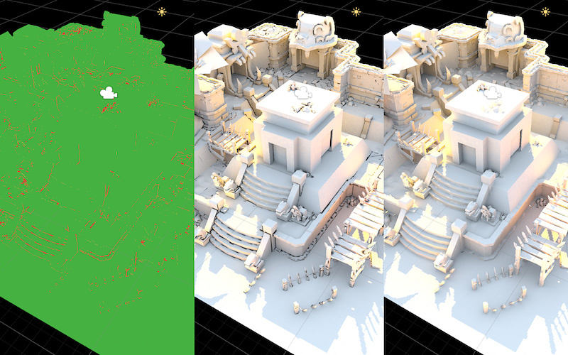 该视图显示最主要的光线方向矢量。请参阅方向光照贴图页面以了解更多信息。方格覆盖层可显示方向性纹理的分辨率。