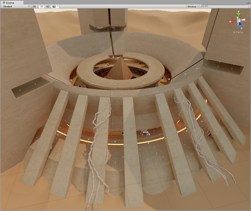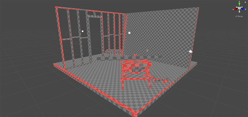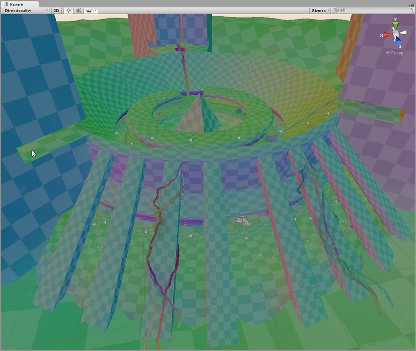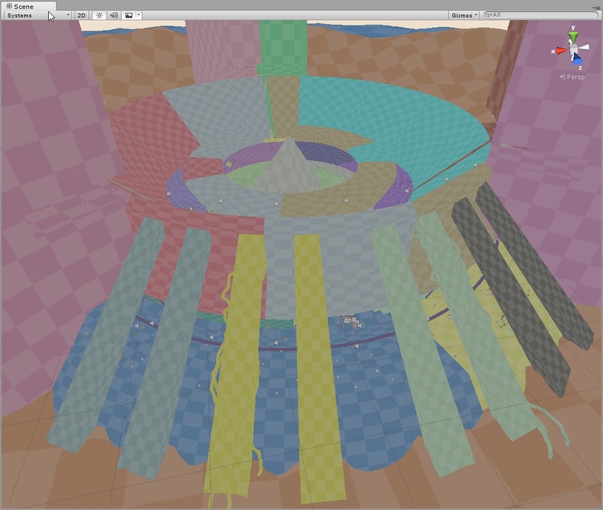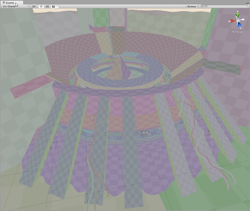此选项显示在计算预计算实时 GI 时使用的优化 UV 布局。这是预计算过程中将自动生成的。完成了实例预计算阶段便立即可用。UV Charts 的 Scene 视图模式可以帮助您识别需要调整 UV 或缩放的几何体(使用光照贴图参数中的 Resolution 参数来更改比例)。调整实时分辨率时,此视图也很有用。每个图表的颜色不同。