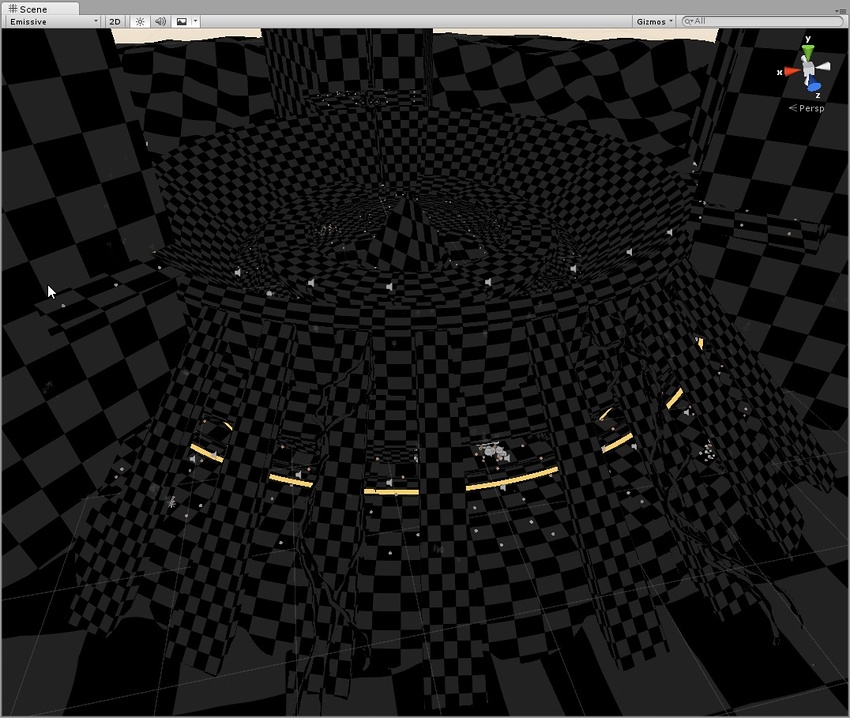 显示计算 GI 时使用的发射。发射是根据材质信息生成的,可通过添加自定义 Meta pass 来完全自定义。方格覆盖层可显示传递给 Enlighten 的发射纹理的分辨率。