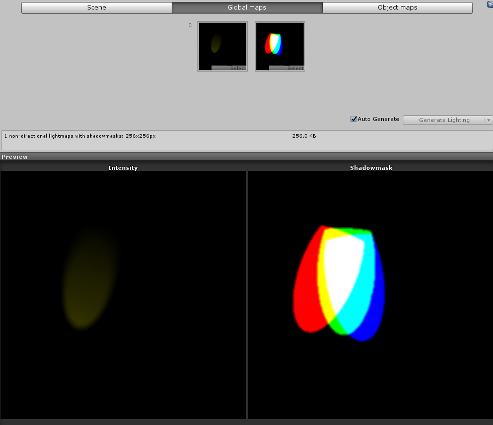 使用 Object maps 选项卡可查看仅限当前所选游戏对象的烘焙纹理的预览,包括阴影遮罩。