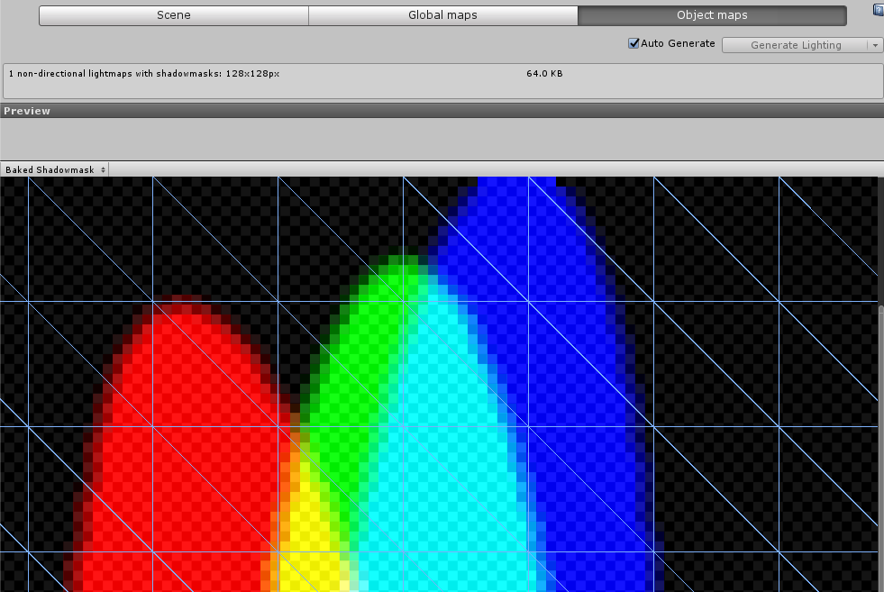 Object maps 选项卡显示当前所选游戏对象的 GI 光照贴图纹理(包括阴影遮罩)的预览。