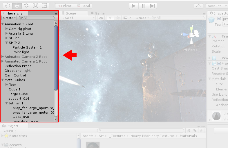 Hierarchy 窗口是场景中每个对象的分层文本表示形式。场景中的每一项都在层级视图中有一个条目,因此这两个窗口本质上相互关联。层级视图显示了对象之间相互连接的结构。 请了解有关 Hierarchy 窗口的更多信息。