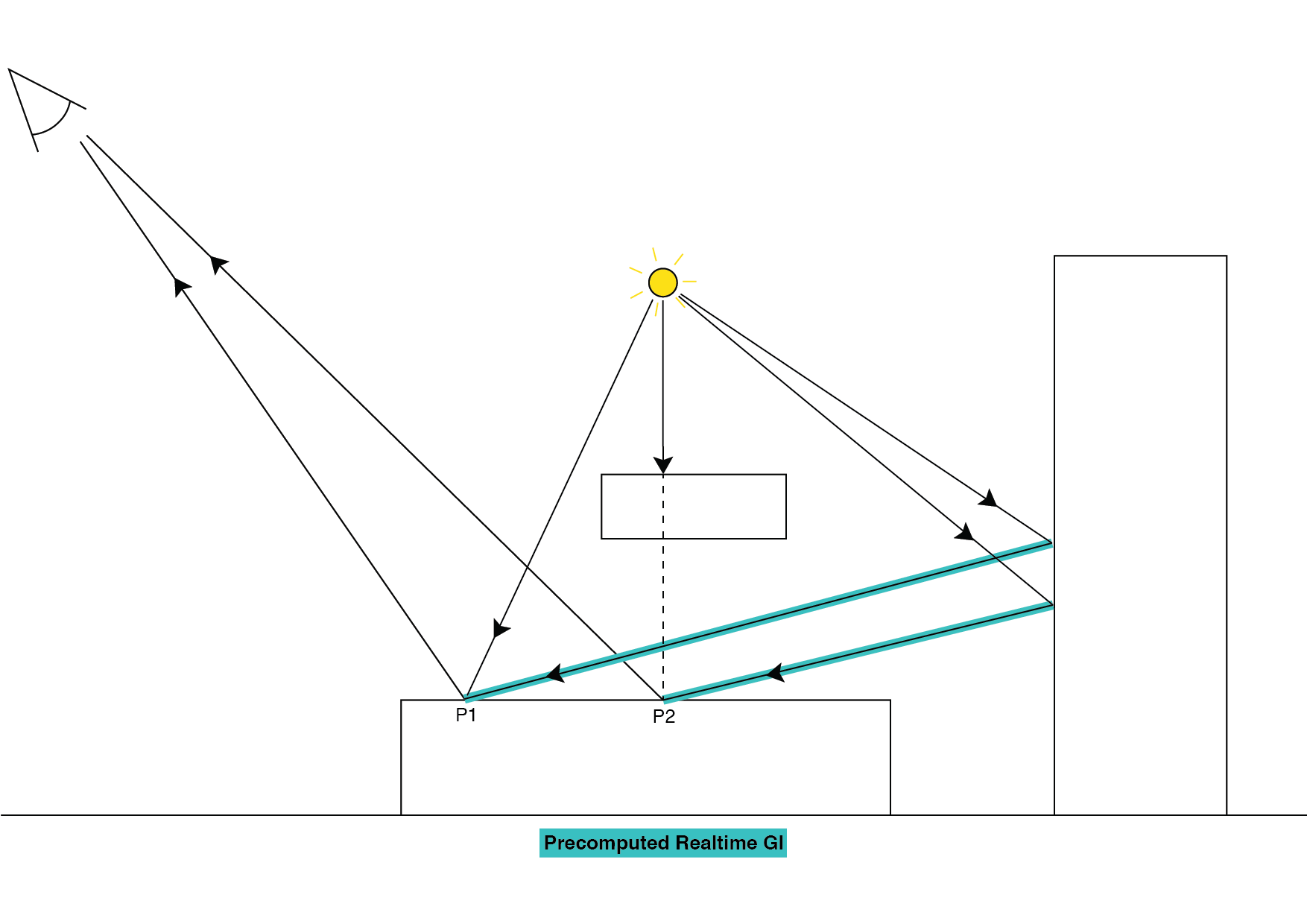 最后一个路径段(即从表面到光发射器的路径段)不是预计算的一部分。存储的唯一信息是,如果表面接受光照,则随后的表面和探针也接受光照,还有各种光照的强度。有一组独立的低分辨率实时光照贴图由 Enlighten 在运行时使用实时光源的信息在 CPU 上进行迭代更新。因为这一迭代过程是计算密集型任务,所以分成多个帧。换句话说,此过程需要多个帧,直到光线完全反射到场景中的静态元素上,并且实时光照贴图和光照探针已经收敛到最终结果。
