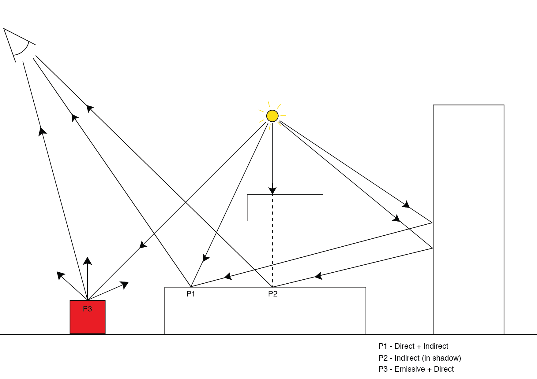 由于光栅器不能跟踪光线,因此实时光照集中于具有最明显影响的光照部分。这些部分就是发射部分,更常见的说法是直接光照。即使在这样的情况下,光路也已经由两段组成:一段是从摄像机到表面,另一段是从表面到光源。