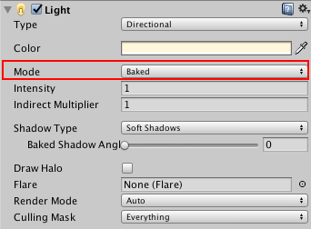 | 烘焙 (Baked) | Lightmapping Settings | Unity 在运行时之前预先计算__烘焙 (Baked)__ 光源产生的光照,而不会将这些光源包括在任何运行时光照计算中。此模式下会预先计算所有烘焙光源。 |