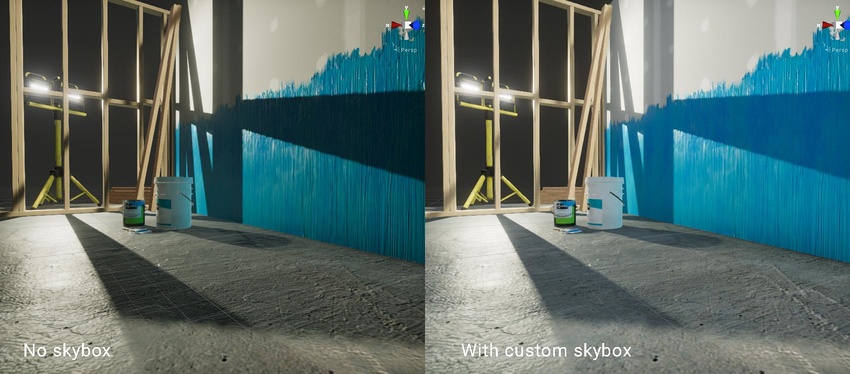 除了所有光源之外,环境光照也会影响全局光照。您可以分配一个自定义天空盒材质 (Skybox Material) 来代替默认的__程序化天空盒 (Procedural Skybox)__ 并调整强度。下面的图像分别显示了在包含和不含__环境光照__的场景中光照如何变化,并提供了较柔和的结果。两个场景中的光源设置相同。Unity 在 Asset Store 中提供了一些自定义的 HDRI 资源。
