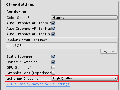 HDR 光照贴图可用于 PC、Mac 和 Linux 独立平台、Xbox One 和 PlayStation 4。Player 设置中的 Other Settings 面板为这些平台提供了 Lightmap Encoding 选项,用于控制光照贴图的编码/压缩。