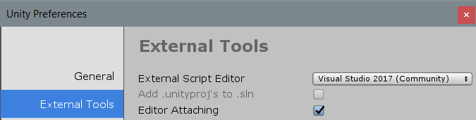 当 Unity Editor 处于播放模式时,可以调试在 Unity Editor 中运行的脚本代码。在尝试调试之前,请确保在 Unity Preferences 中启用了 Editor Attaching 选项。此选项会让 Editor 采用即时 (JIT) 编译方法并借助调试信息来执行托管代码。