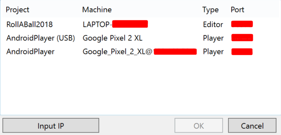 可以通过查看 Unity Player 日志来确定 Player 要求 IDE 使用的 IP 地址。查找日志中如下所示的部分: