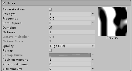 | Damping | 启用此属性后,强度与频率成正比。将这些值绑在一起意味着可在保持相同行为但具有不同大小的同时缩放噪声场。 |