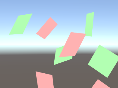 上面的着色器使用 Cull 状态来关闭背面剔除(默认情况下,根本不会渲染背面三角形)。以下是应用于一组四边形网格(以不同的方向旋转)的着色器: