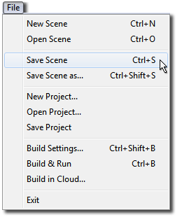 要保存对场景的更改,请从 File 菜单中选择 Save Scene,或按 Ctrl/Cmd + S。 这样可以保存当前对场景的更改并执行“Save Project”(见下文)。