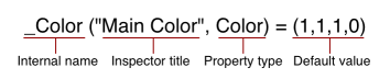 属性在 Properties 代码块中的单独行上列出。每个属性都以内部名称(__Color、MainTex__)开头。后面括号中显示的是在检视面板中显示的名称以及属性类型。随后列出此属性的默认值: