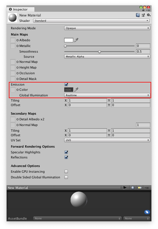 Baked - 此材质的自发光被烘焙到场景的静态光照贴图中,因此其他附近的静态游戏对象看起来被此材质照亮,但动态游戏对象受到影响。