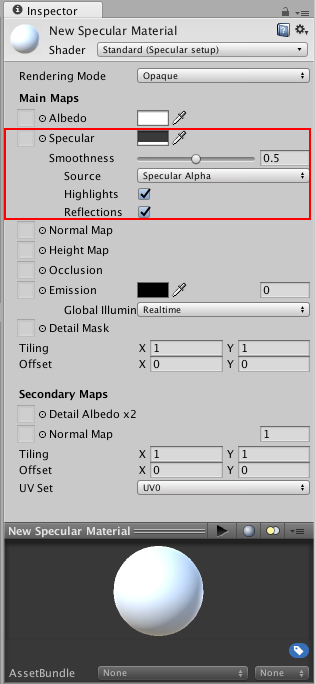 Specular 参数仅在使用 Specular setup 时可见,如上图的 Shader 字段中所示。镜面反射 (Specular) 效果本质上是场景中光源的直接反射,通常会在对象表面上显示为明亮的高光和反光(尽管镜面高光也可能是微妙或漫射的)。