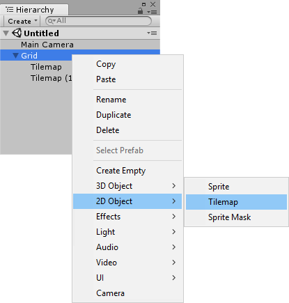 选择 Grid 游戏对象或 Tilemap 游戏对象来创建其他 Tilemap,然后选择菜单:__GameObject__ > 2D Object > Tilemaps__,或右键单击所选的游戏对象并选择 2D Object__ > Tilemap