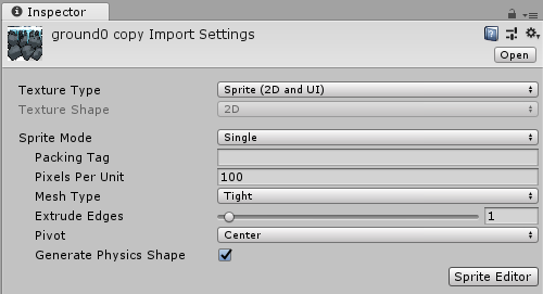 导入精灵后,通过打开每个精灵的 Sprite Editor 并编辑它们的轮廓即可优化轮廓。对于等距瓦片地图中的精灵,应该设置精灵的 Pivot 属性,使“ground”相对于精灵。