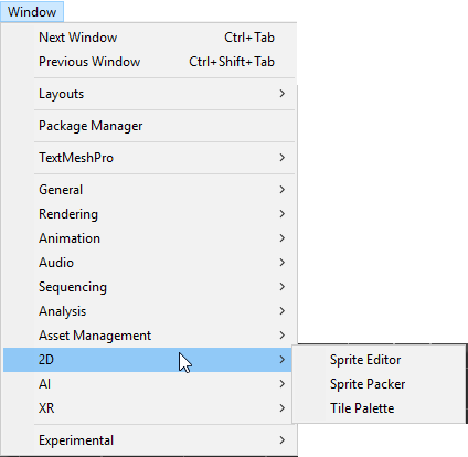 在 Tile Palette 窗口中使用选定的瓦片来创建面板,这些面板可用于在瓦片地图上进行绘制。从菜单 Window > 2D > Tile Palette 中打开 Tile Palette 窗口。
