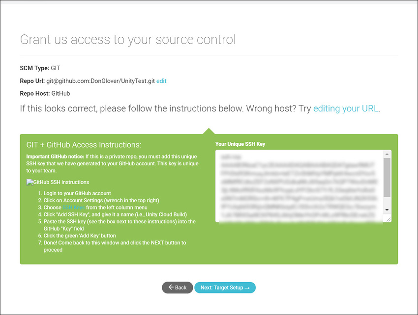 Unity Cloud Build 连接到托管站点时,它会自动检测您的仓库是公开还是私有代码仓库。如果仓库是公开代码仓库,Cloud Build 自动与其连接,而您可以跳至设置目标编译平台