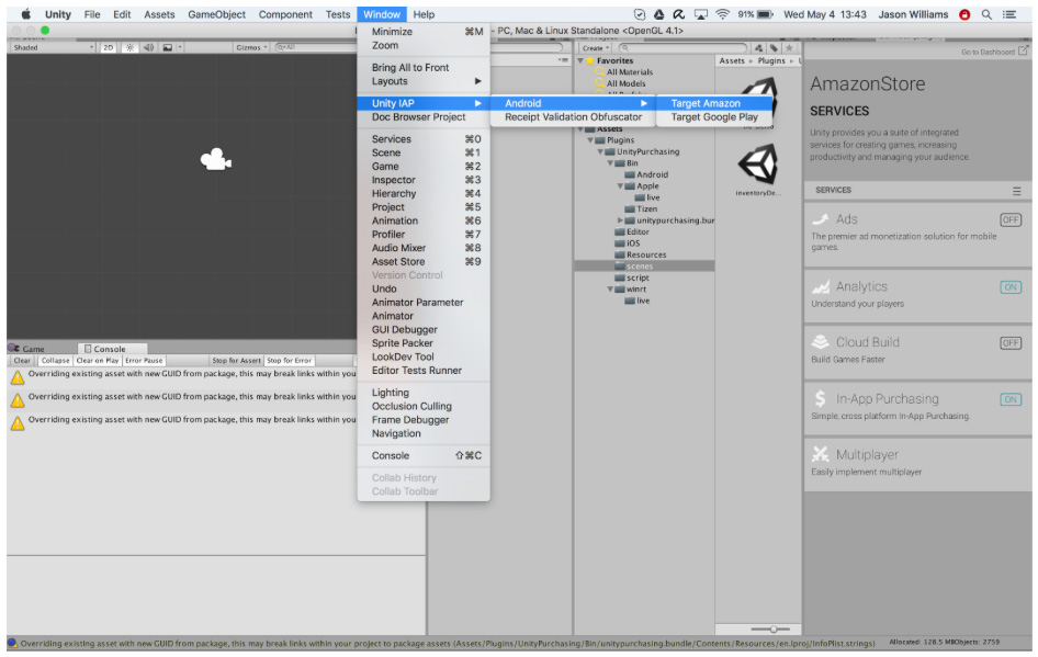 1.导入 Unity IAP 插件。请参阅设置 Unity IAP 以了解更多信息(Unity 5.3 或更高版本)。 1.设置 IAP 目标商店。您应该已经设置好一个 Android 应用程序。请使用 Unity IAP Window > Unity IAP > Android > Target Amazon 菜单项来设置目标商店。此菜单项用于在 Google、Amazon 和其他 Android 应用商店之间切换。
