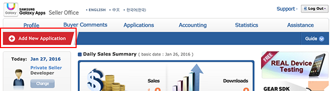 向 Samsung Galaxy Apps Seller Office 注册 Android 应用程序。