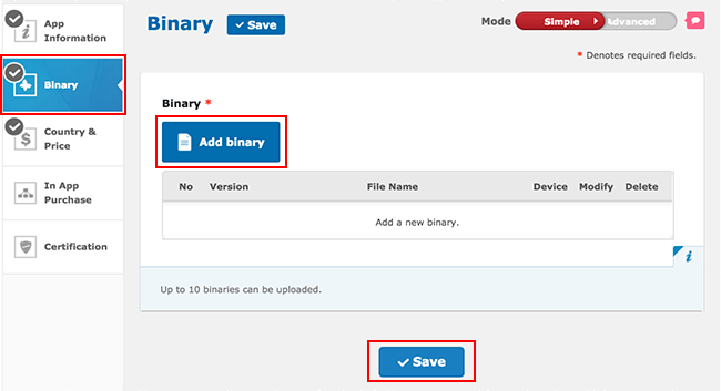 在 App Store Developer Console 中,转至 Binary__,然后选择 Add binary__。