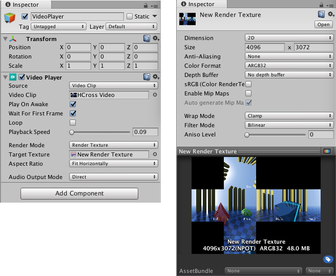 现在,打开__视频播放器__的 Inspector 窗口,并将 Render Mode 切换到 Render Texture。将新的渲染纹理从 Asset 视图拖到 Target Texture 字段。