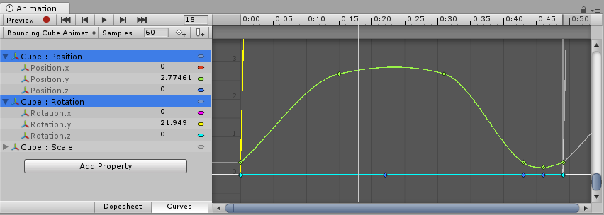 使用__曲线__模式来查看动画时,必须了解有时每个属性的各种范围会有很大差异。例如,考虑一个用于旋转弹跳立方体的简单动画剪辑。弹跳 Y 位置值可在 0 到 2 的范围之间变化(意味着在动画期间立方体弹跳高度为 2 个单位);但是,旋转值的范围是从 0 到 360(表示其旋转度数)。同时查看这两条曲线时,位置值的动画曲线将很难显示出来,因为视图将缩小以适应窗口内旋转值的 0–360 范围: