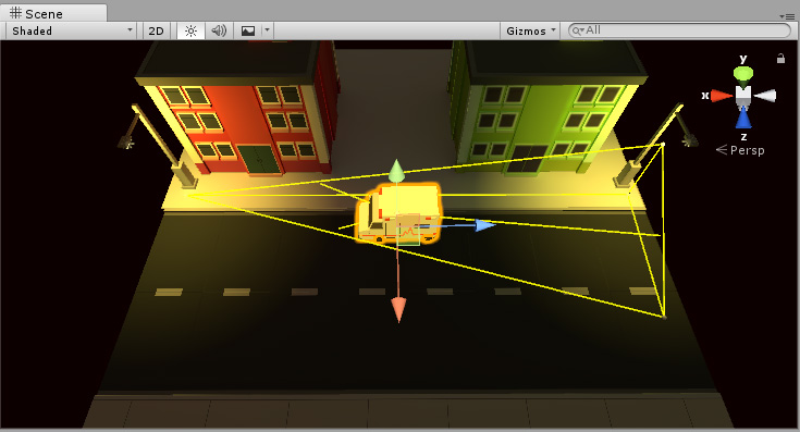 现在,救护车在场景中心时,车上的光照更暗,这符合要求。