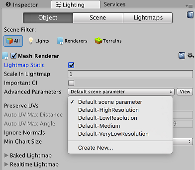 要将光照贴图参数资源分配给网格渲染器,请勾选该组件的 Lightmap Static 复选框,然后从 Lightmap Settings 下的 Lightmap Parameters __ 中选择一个选项。选择 Scene Default Parameter__ 即可使用分配给整个场景的同一光照贴图参数资源。