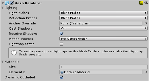 | Dynamic Occluded | 启用此复选框可向 Unity 指示即使该对象未标记为静态,仍应该对该游戏对象执行遮挡剔除。 |