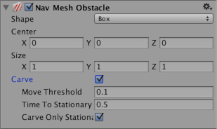 Move Threshold 当导航网格障碍物的移动距离超过 Move Threshold 设置的值时,Unity 会将其视为移动状态。使用此属性可设置该阈值距离来更新移动的雕孔。