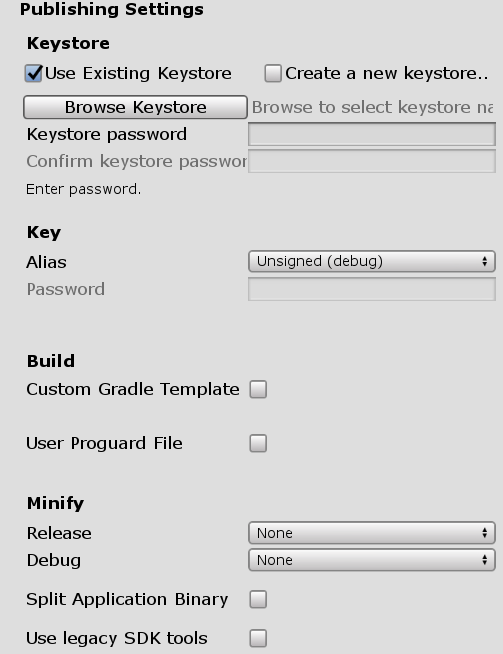 注意:出于安全考虑,Unity 不会在此页面上保存密码。默认情况下,未签名的调试密钥库位于 MacOS 上的 ~/.android/debug.keystore 和 Windows 上的 %USERPROFILE%\\.android\debug.keystore 中。