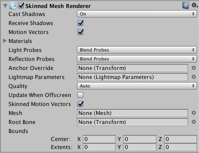 | Update When Offscreen | 如果启用此属性,即使任何摄像机都无法看到蒙皮网格,也会对其进行更新。如果禁用此属性,当游戏对象在屏幕外时,动画本身也将停止运行。 |