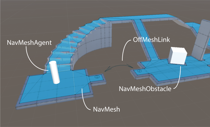 导航系统可让您创建能够在游戏世界中导航的角色。该系统让角色能够理解自身需要走楼梯才能到达二楼或跳过沟渠。Unity 导航网格 (NavMesh) 系统包含以下部分: