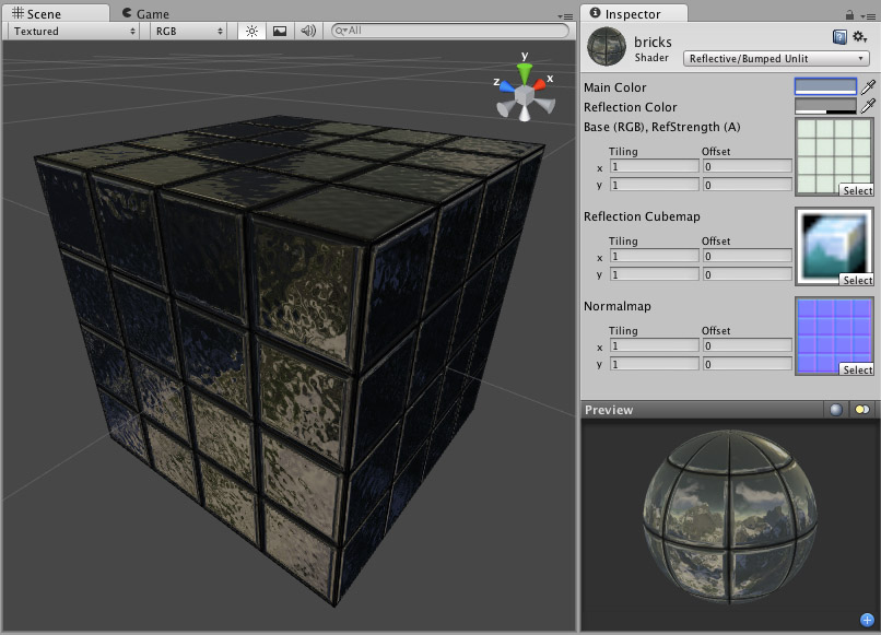 此着色器将模拟反射表面,如汽车、金属物体等。它需要一个环境立方体贴图来定义具体的反射。主纹理的 Alpha 通道定义了对象表面上的反射强度。任何场景光源都会在反射对象上增加亮度。