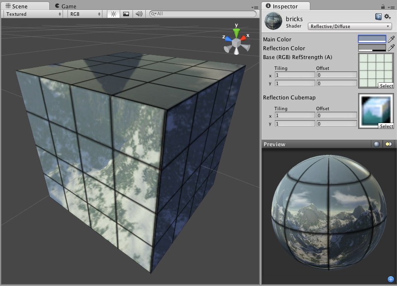 此着色器将模拟反射表面,如汽车、金属物体等。它需要一个环境立方体贴图来定义具体的反射。主纹理的 Alpha 通道定义了对象表面上的反射强度。任何场景光源都会在反射对象上增加亮度。