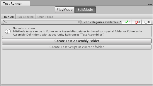 To open the Unity Test Runner, open Unity and go to Window > General > Test Runner. If there are no tests in your Project, click the Create Test Script in current folder button to create a basic test script. This button is greyed out if adding a test script would result in a compilation error. The conditions for adding a test script are in the Editor folder, or any folders using Assembly Definition files that reference test assemblies (NUnit, Unity Test Runner, and user script assemblies).