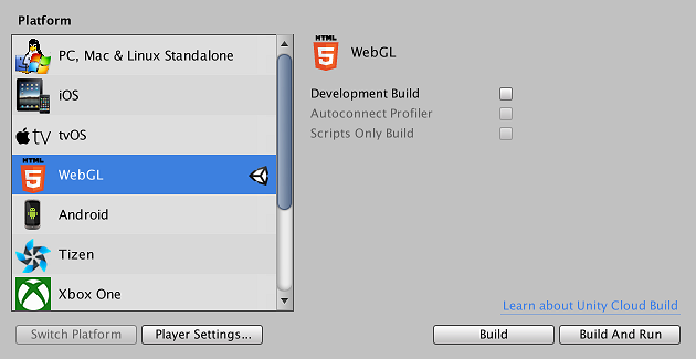 可通过 Build Settings 对话框访问 WebGL 选项。(菜单:__File__ > Build Settings…)。在该对话框中,从 Platform 列表中选择 WebGL__,然后选择 Player Settings…__。