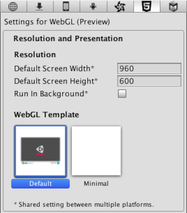 构建 WebGL 项目时,Unity 会将播放器嵌入到 HTML 页面中,以便能在浏览器中进行播放。默认页面是一个简单的白色页面,其中的灰色画布上有一个加载进度条。或者,可在 Player 设置(菜单:Edit > Project Settings,然后选择 Player 类别)中选择最小模板(仅使用必要的样板代码来运行 WebGL 内容)。
